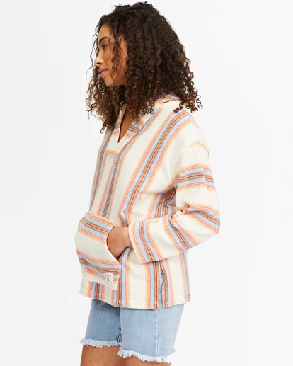 Get swept away by the warm southwest winds in the Baja Sands hooded sweatshirt. Made in a relaxed fit, the women’s pullover sweatshirt from our Sunny Side Down Up is crafted with super-soft looped terry fabric and styled with a striped print, a V-neckline, and a kangaroo pocket. Cozy and comfortable, this hoodie is your go-to for everything from surf check to sunset.