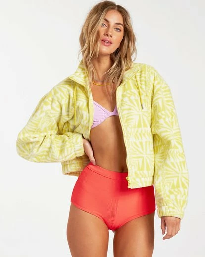 A tropical take on a fleece jacket, the Billabong Cheeko transcends latitudes and decades. Cut with a vintage-inspired wider, cropped silhouette, the women’s jacket is made from extra warm double fleece, printed with an islander-inspired pattern throughout. Functional details include a zip front, mock neck and elastic at the cuffs and hem to keep the heat in.