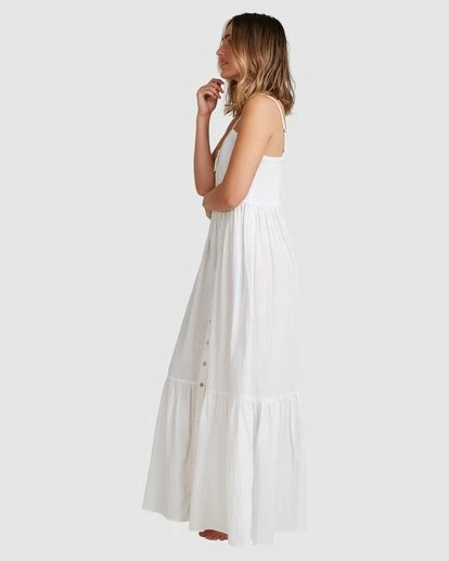 Holiday mood at an all-time high in this maxi dress. Designed with tie front bodice for added dimension and maximum beach vibes. Featuring removable and adjustable straps, button up centre front, smocked back panel, and long bottom ruffle for additional detailing.