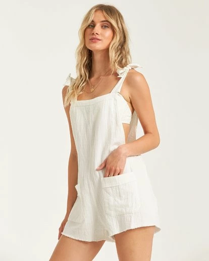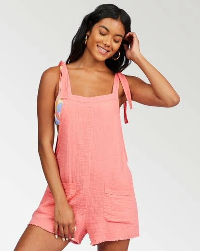 Girls just wanna have sun. It’s all good vibes and girly trims in this relaxed romper overall, trimmed with knotted ties at the shoulders and deep cuts. Easy to toss over swim or a fitted tee, the Girl On The Run Overalls keep the mood, and the fabric, light with a pucker gauze, finished with patch pockets, a raw hem and deep V cut at the back.
