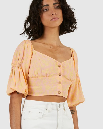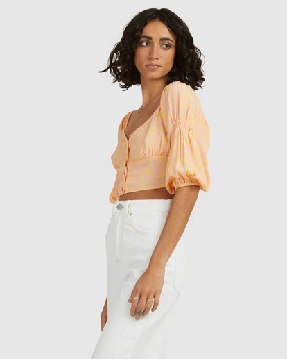 For those who only wear clothes laced with sunshine. The Hot Tropics Top is semi-cropped, made with soft viscose crepe, and bursting with paradise vibes. Femininity at its finest, this little daydream features a front button placket, a bust panel with gathering, puff sleeves, and shirring details throughout.