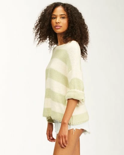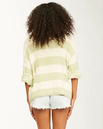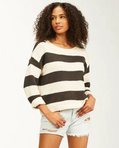 Find your happy place in the Billabong Lost Paradise. Oversized and slouchy, the women’s sweater relaxes into laid-back lines all around with wide knit stripes. The women’s striped sweater is cut with a wider crew neckline and full sleeves.