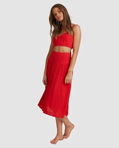Make a statement in this fabulous skirt from the Billabong x Steph Claire Smith Collection. The Mrs Miller Skirt is a fun piece to add to your wardrobe this season and spice up any occasion. Featuring a bold red and fitted body panel before flowing into a stunning swish skirt.