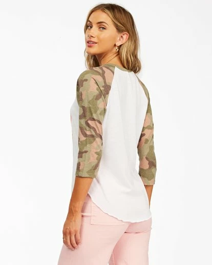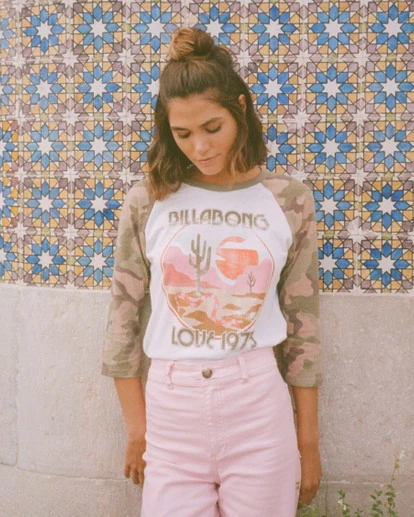 With camo sleeves and a groovy graphic hit, this baseball tee has all of the elements of a custom staple. Made from a soft and stretchy jersey knit blend, the womens 3/4 sleeve tee stands out with camouflage sleeves and a sunset graphic print at the front. A burnout wash brings in a vintage look and feel.