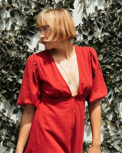 Replaying relaxed vintage lines, the Run Wild lets time stand still while you wander on. A vintage-inspired midi dress is made from textured cotton slub for a natural feel, cut with short pull sleeves and a low V neckline. The woven dress is finished with buttons down the center front.