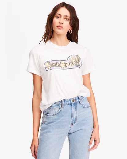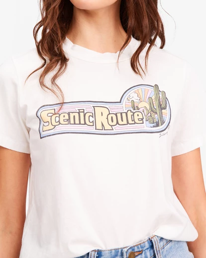 Spontaneous and carefree, take the long way home in the Scenic Route rockers crewneck t-shirt. A premium lightweight tee with statement graphics and a vintage shape that fits narrower throughout, this women’s t-shirt is made to look and feel like our favorite tees from days gone by. Your tan may fade, but good style lasts forever.