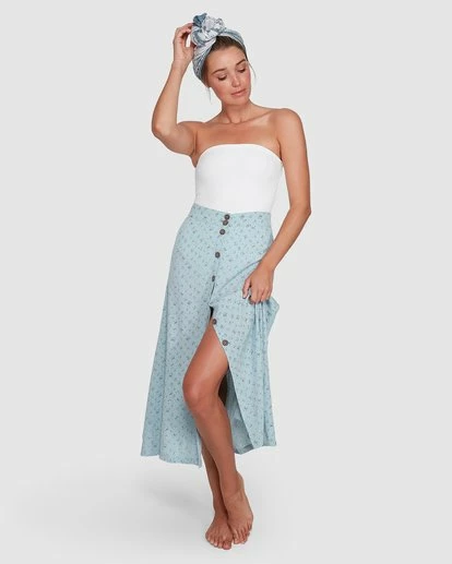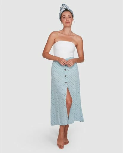 The Seamist Skirt is an easy breezy style displaying a floral print in beautiful ocean hues. This maxi is designed with a functional front button placket, fixed waistband and pleats at the back for a flattering fit.