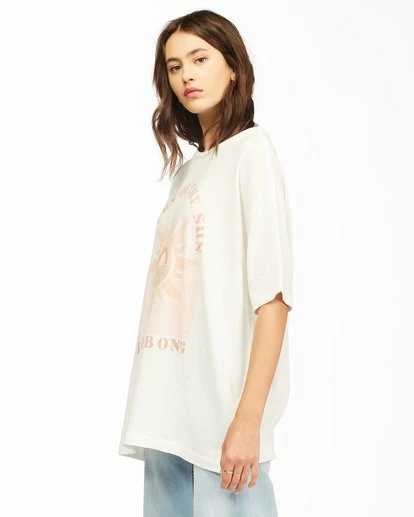 Lovers of the sun unite in the Shine Bright T-Shirt. An oversized graphic tee that matches your natural glow, this women’s true boy style t-shirt is made with cotton jersey in a mid-weight thickness reminiscent of a vintage tee from the 80s. Piece dyed to create a naturally well-worn look and feel, this year-round staple features a statement graphic printed on the front chest.