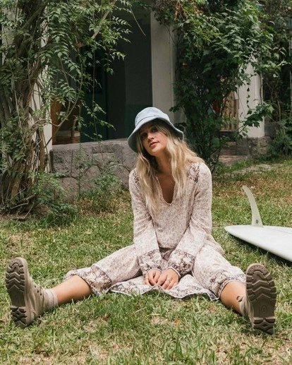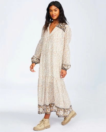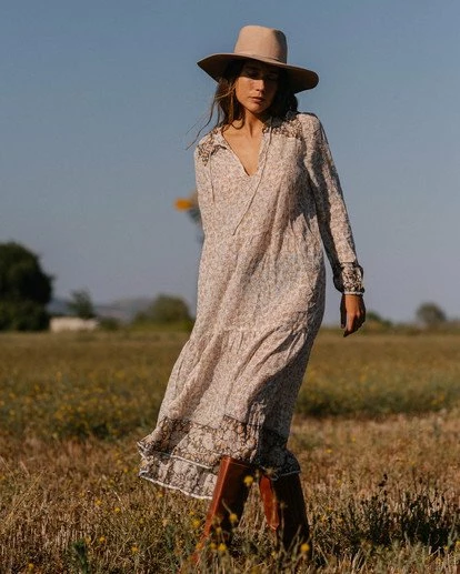 Giving into nomadic tendencies, the Storm Rider takes inspiration from gypsy lines, adding lounge-worthy comfort to the mix. A bohemian midi dress finds an effortless form with a relaxed fit throughout, long blouson sleeves and a ruffled hem tier. Made from ultra flowy and lightweight gauze, the printed midi dress is finished with peasant top-inspired ties at the neck.