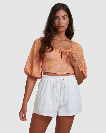 Time for fun in the Summer Sun. This top features elasticated puff sleeves and a fitted bodice with shaping gathers to contour your shape. Pair with a pair of high waisted straight leg jeans and kitten heels to finish off the look.