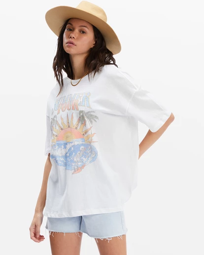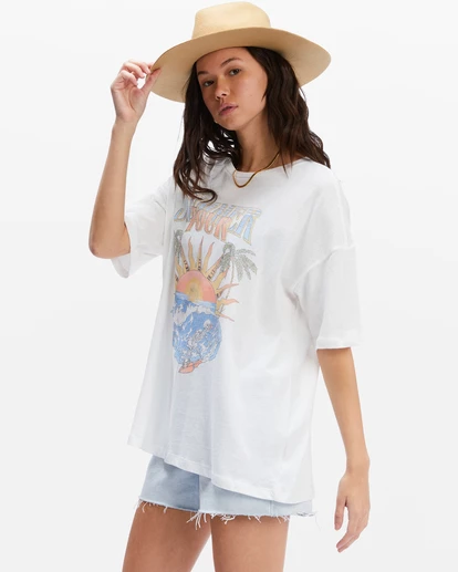 Whether you’re chasing the swell or following the band, the Summer Tour T-Shirt is exactly what you want to be wearing on the ride. This women’s boyfriend tee offers an oversized fit with a soft, lightweight feel made with premium cotton jersey. The statement chest graphic adds sun kissed style, and the piece-dyed color wash gives it a slightly faded, vintage feel.