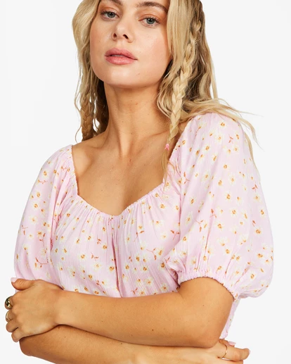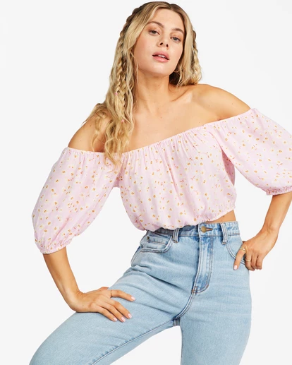 Femininity at its finest. With dreamy off-the-shoulder puff sleeves and a pretty prink floral print, the Sun City crop top is the epitome of Springtime romance. This women’s top is made with premium crinkle fabric that gives it a silky-soft feel and features elasticated bands at the hems to maintain its stunning shape.