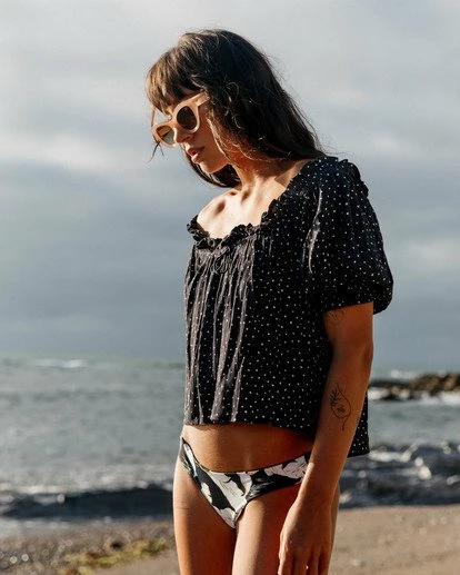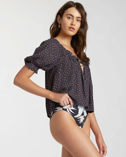 The Billabong Sunny Skies Top cuts through any negative vibes with carefree lines. A short and sweet women’s top is made from floral print crinkle fabric for a floaty drape, cut with a relaxed fit and slightly cropped length. Designed to wear on or off the shoulder, the short sleeve top features a tie at the center front neckline and ruffle trim at the sleeves and neck.