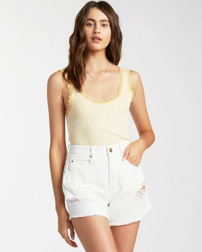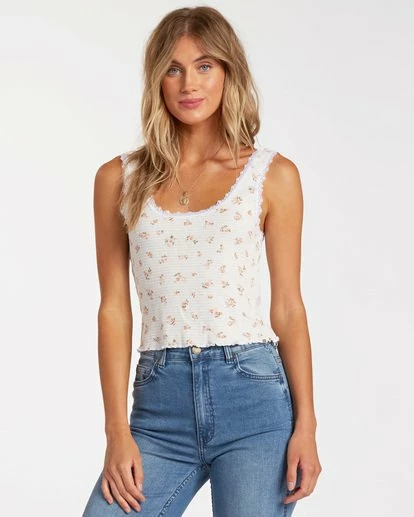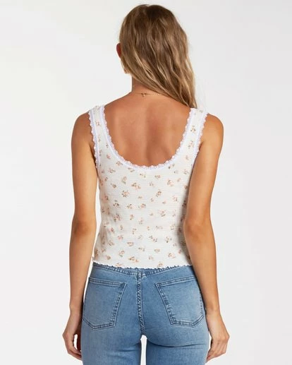 Layer in the feminine vibes with the Billabong Sweet Days Tank Top. And essential rib knit tank top for women, the Sweet Days is cut with a fitted silhouette for easy layering. Made from soft and sweet pointelle rib knit, the sleeveless top is finished with a floral print and lace trim at the scoop neck.