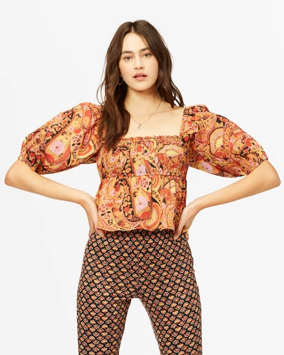 We can’t physically teleport you back into the 70s – we wish we could! – so we brought the spirit of the 70s to you with the You Wish Top. This women’s top offers a cropped fit with puff sleeves and a peplum hem. Grooving strong with retro vibes, this throwback beauty shines with a bold color palette in a paisley print. Right on.